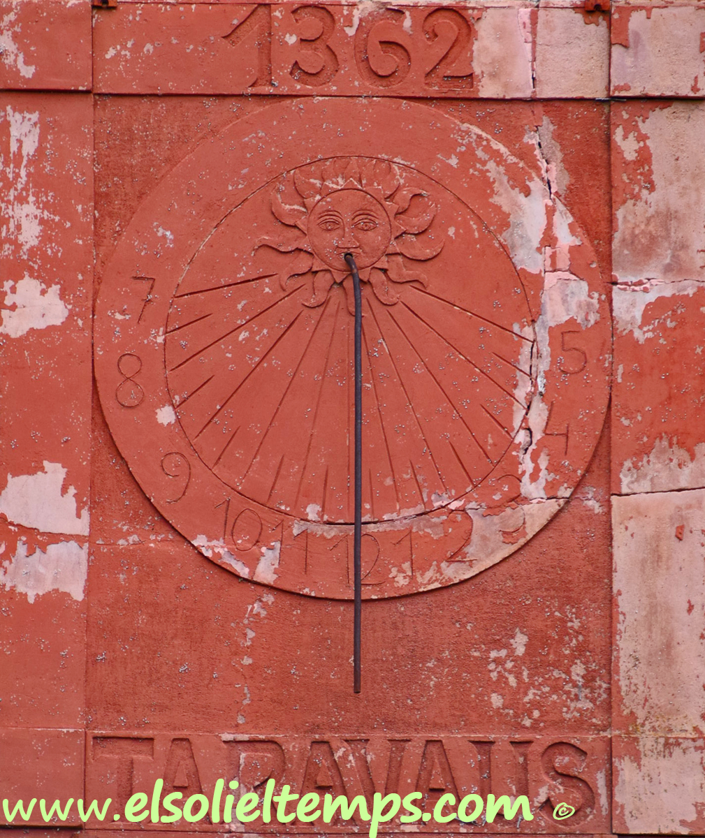 :: DESCRIPCIÓ: Vertical de matí, quadrat, amb un cercle al mig on hi ha marcades les hores, números àrabs (de 7 a 5) i les línies de les hores i mitges hores curtes, gnòmon (25 cms) vareta, datat, elevació 80 mts. snm.