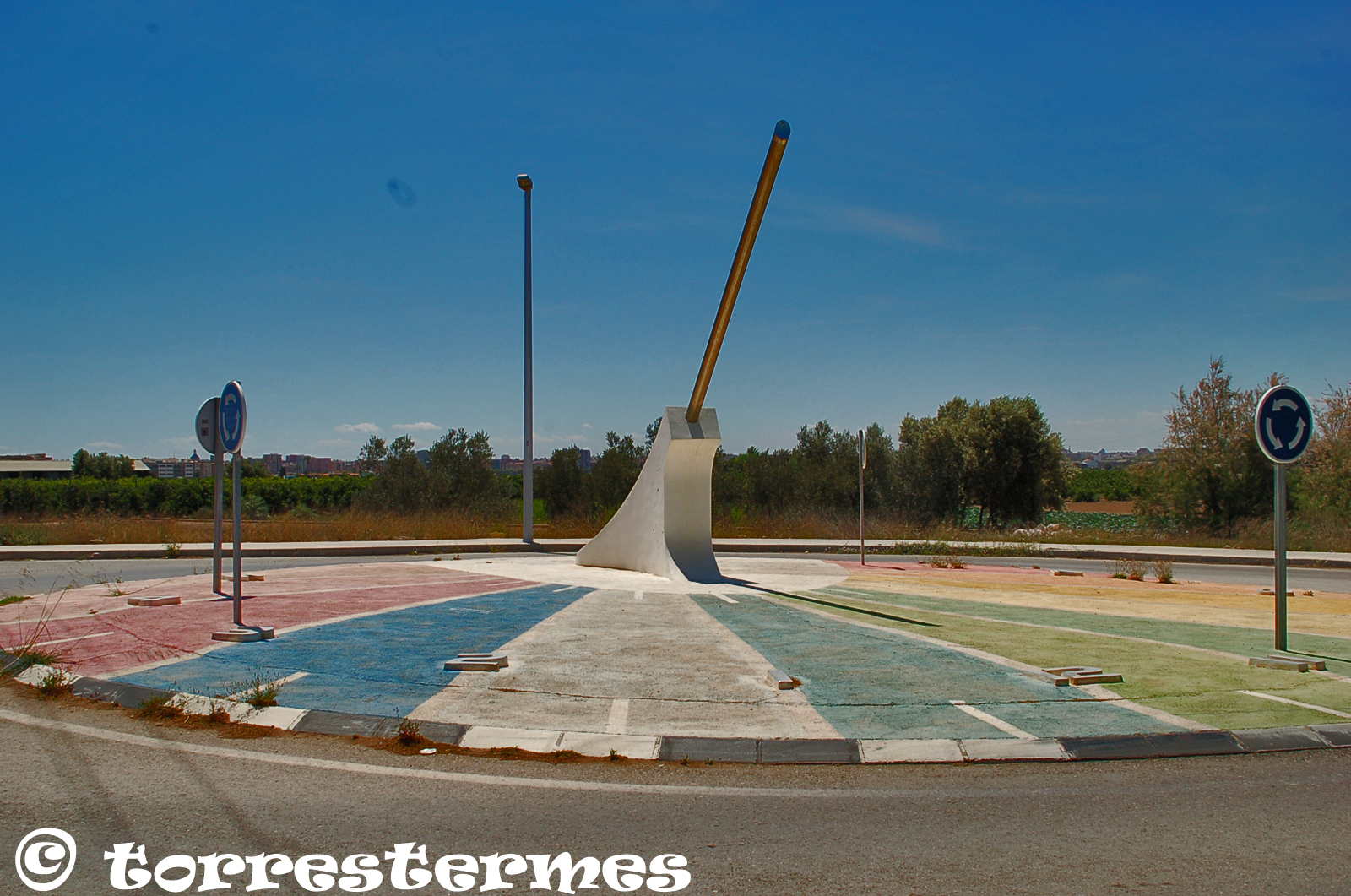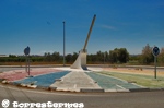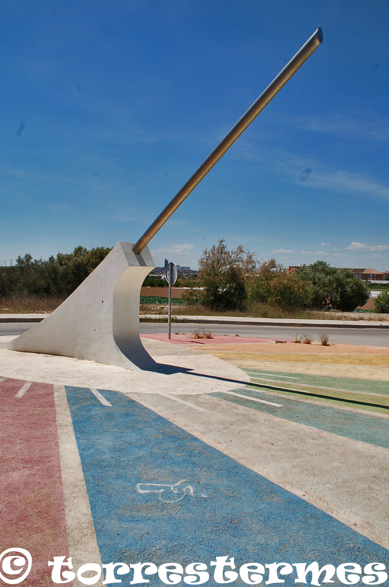 :: DESCRIPCIÓ: Horitzontal circular, de grans dimensions, situat al centre d'una rotonda, franges horàries de colors, hores i mitges hores, números àrabs (de 7 a 5), gnòmon (7 mts) gran barra d'acer, elevació 14 mts. snm.