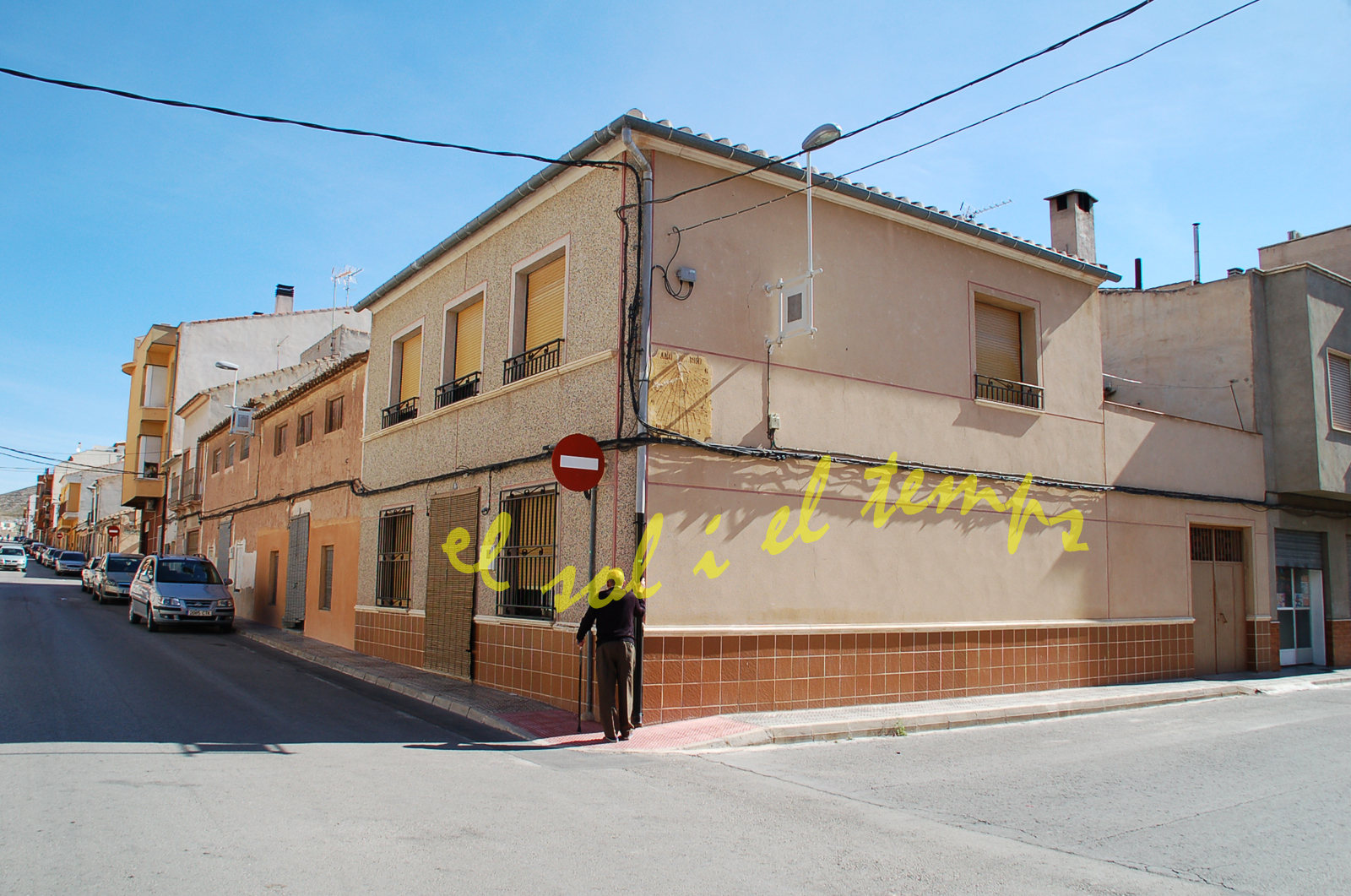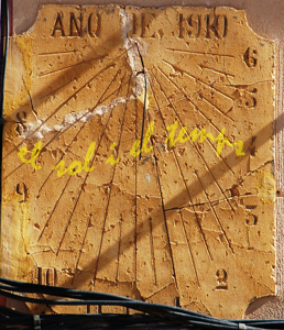 :: DESCRIPCIÓ: Vertical meridional, línies horàries i mitges hores més curtes, números àrabs (de 8 a 6), gnòmon (30 cms) recolzat i tort, datat