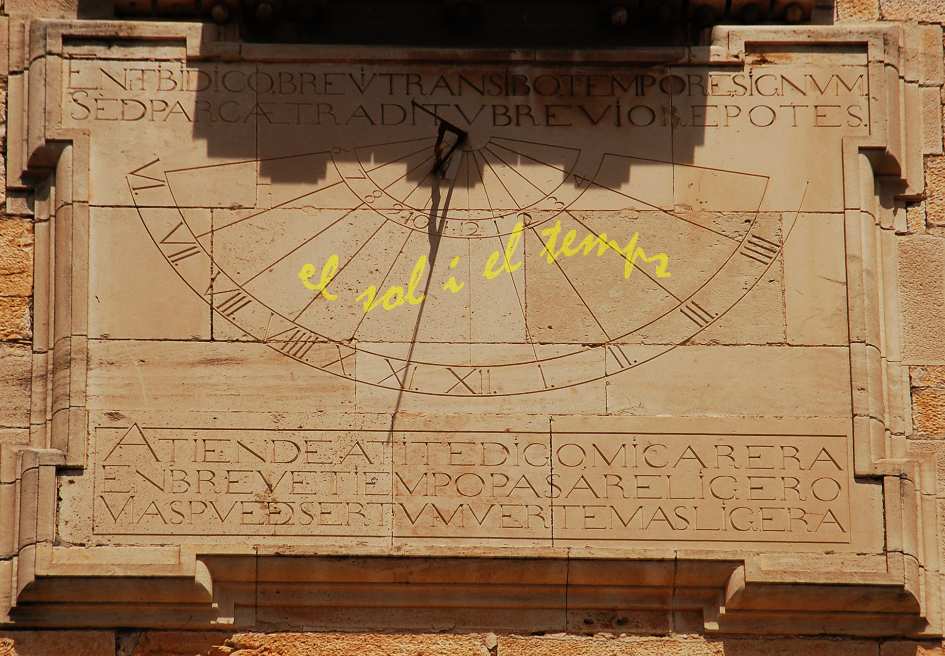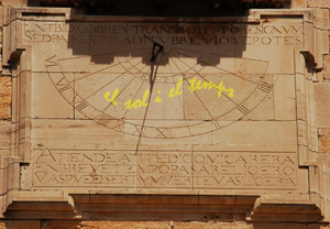 :: DESCRIPCIÓ: Vertical rectangular de matí, horari solar real, línies horàries, dos semicercles amb doble numeració (de VI a IIII i de 6 a 4), gnòmon (25 cms) recolzat, lema en llatí i castellà