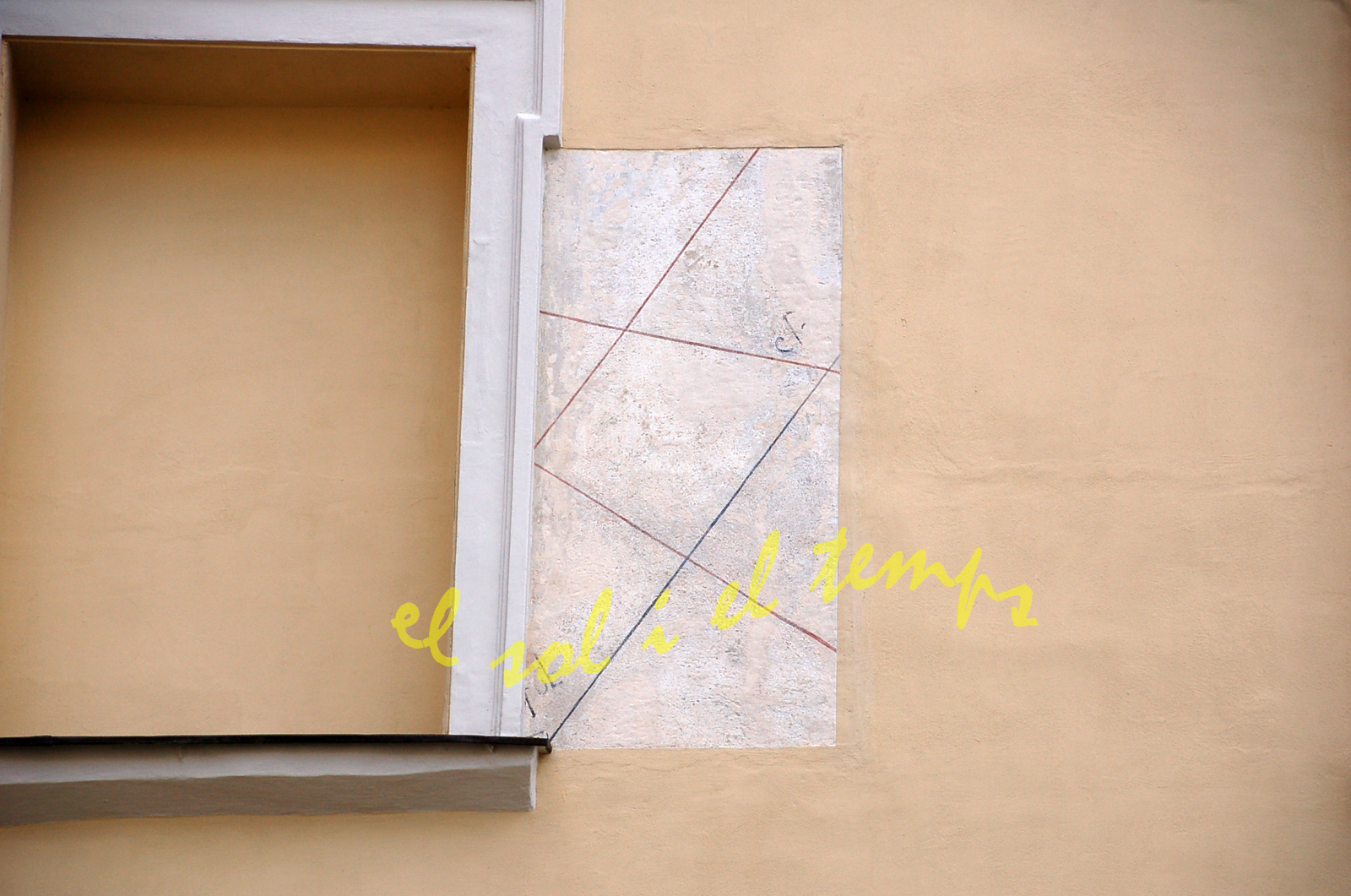 :: DESCRIPCIÓ: Vertical declinant a ponent, línies horàries i mitges hores, numeració aràbiga (de 3 a 3), gnòmon absent, alçada (107 mts)