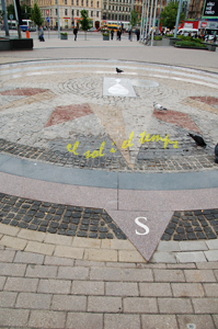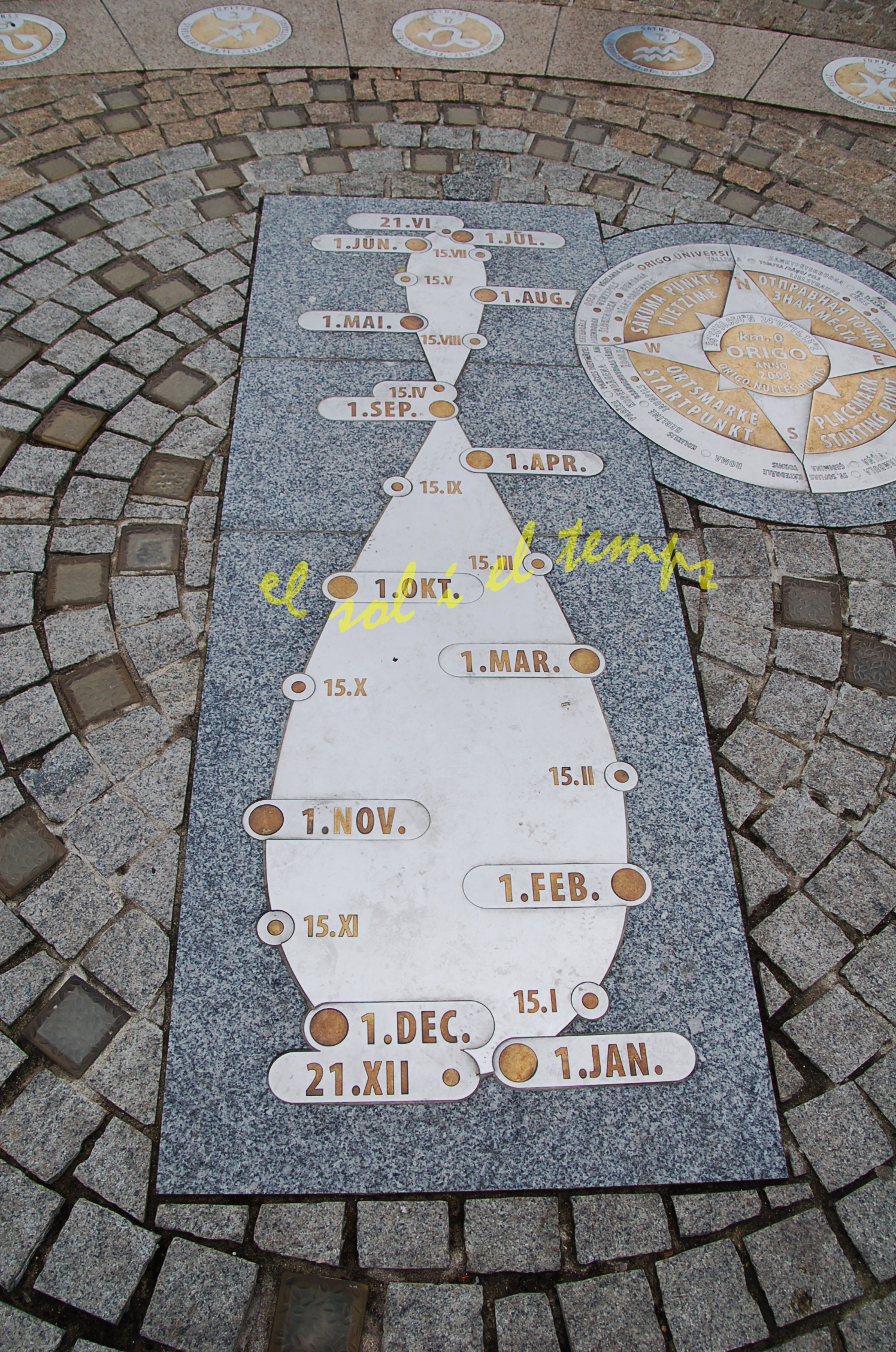:: DESCRIPCIÓ: Horitzontal circular incrustat a terra davant de l'estació central, sense línies, doble numeració d'estiu i d'hivern, el gnòmon es l'ombra de la persona situada sobre el mes corresponent inscrit en una analema central, signat i datat, alçada (26mts)