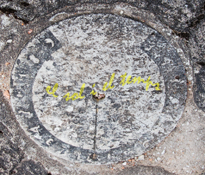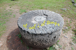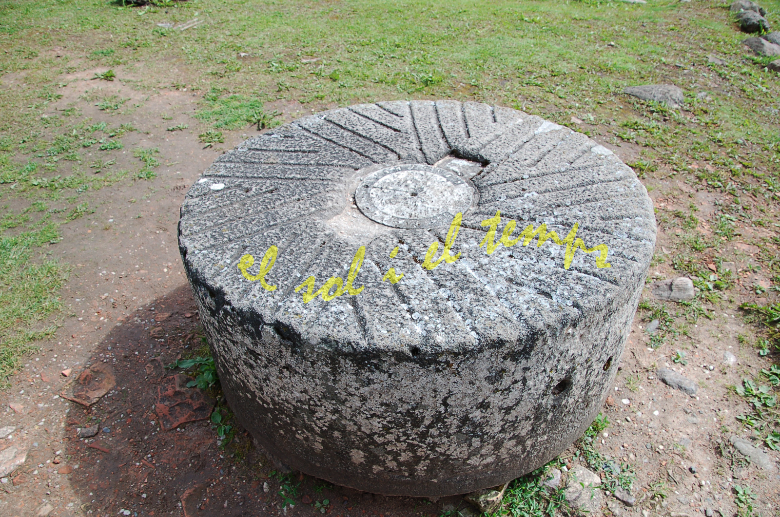 :: DESCRIPCIÓ: Quadrant del segle XV incrustat en una pedra cilíndrica, utilitzat per marcar el temps en actes religiosos i activitats econòmiques, circular, línies horàries, números àrabs (de 3 a 9), sense gnòmon, alçada (78 mts)