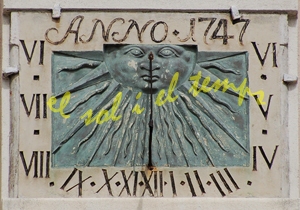 :: DESCRIPCIÓ: Vertical rectangular meridional, decorat amb un sol els rajos fan de línies horàries, números romans (de VI a VI), gnòmon (30 cms) recolzat, datat, alçada (29 mts)