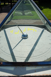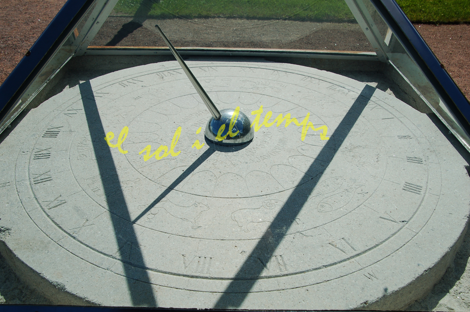 :: DESCRIPCIÓ: Horitzontal circular, línies horàries curtes, números romans (de I a XXIV) en corona, signes del zodíac, gnòmon (20 cms) vareta, alçada (16 mts)