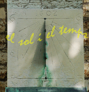 :: DESCRIPCIÓ: Vertical meridional, gravat a la pedra, línies horàries, números àrabs (de 6 a 6) en marc, gnòmon (25 cms) triangular, datat, alçada (41 mts)