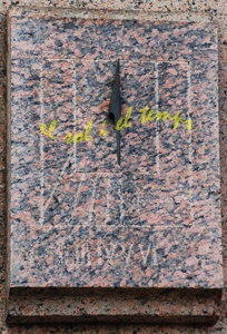 :: DESCRIPCIÓ: Columna piramidal de granet amb tres quadrants gravats, datats, el de la dreta, mirant al riu, orientat a ponent, línies horàries dins de marc, números romans (de I a VI), gnòmon (25 cms) placa encunyada, alçada (12 mts)