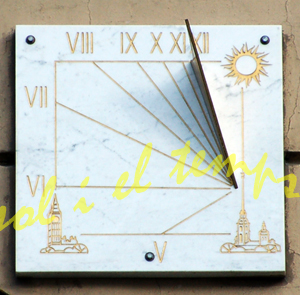 :: DESCRIPCIÓ: Vertical molt declinant de tarda, línies horàries, números romans (de XII a V), gnòmon (30 cms) triangular, alçada (11 mts)