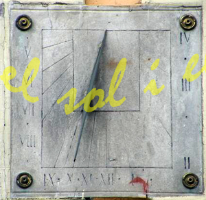 :: DESCRIPCIÓ: Parella de rellotges complementaris, el de matí, línies horàries i mitges hores, números romans (de V a IV) en marc, gnòmon (20 cms) triangular, alçada (8 mts)