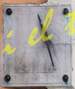 :: DESCRIPCIÓ: Parella de rellotges complementaris, el de tarda, línies horàries i mitges hores, números romans (de X a IX) en marc, gnòmon (20 cms) triangular, alçada (8 mts)
