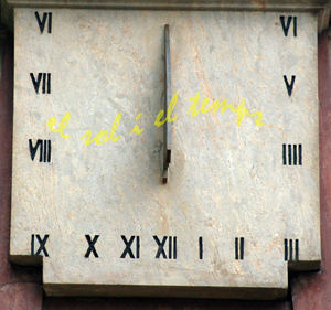 :: DESCRIPCIÓ: Parella de rellotges situats en un obelisc piramidal antic punt quilomètric, el meridional, sense línies, números romans (de VI a VI), gnòmon (25 cms) triangular, alçada (14 mts)