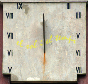 :: DESCRIPCIÓ: Parella de rellotges situats en un obelisc piramidal antic punt quilomètric, el septentrional, sense línies, números romans (de V a IX i III a VII), gnòmon (25 cms) triangular, alçada (14 mts)