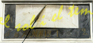 :: DESCRIPCIÓ: Parella de quadrants rectangulars orientats a mati, situats en la façana de l'edifici, línies horàries, mitges hores i quarts, números àrabs (de 4 a 2) en marc, gnòmon (60 cms) encunyat, alçada (149 mts)