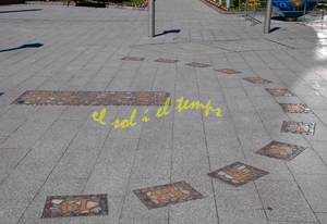 :: DESCRIPCIÓ: Horitzontal circular incrustat a terra, hora d'estiu, sense línies, números àrabs (de 8 a 19), el gnòmon es l'ombra de la persona situada sobre el mes corresponent inscrit en una analema central, alçada (155 mts)