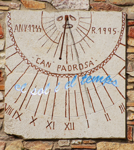 :: DESCRIPCIÓ: Lleugerament declinant a llevant, estil rural, línies horàries i mitges hores més curtes, números romans (de VIII a III), gnòmon (40 cms) acabat en bola, datat, elevació (77 mts)