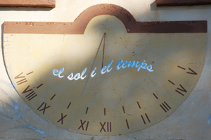 :: DESCRIPCIÓ: Vertical semicircular, línies horàries molt curtes, números romans (de VII a V), gnòmon (25 cms) vareta, elevació 111 mts.