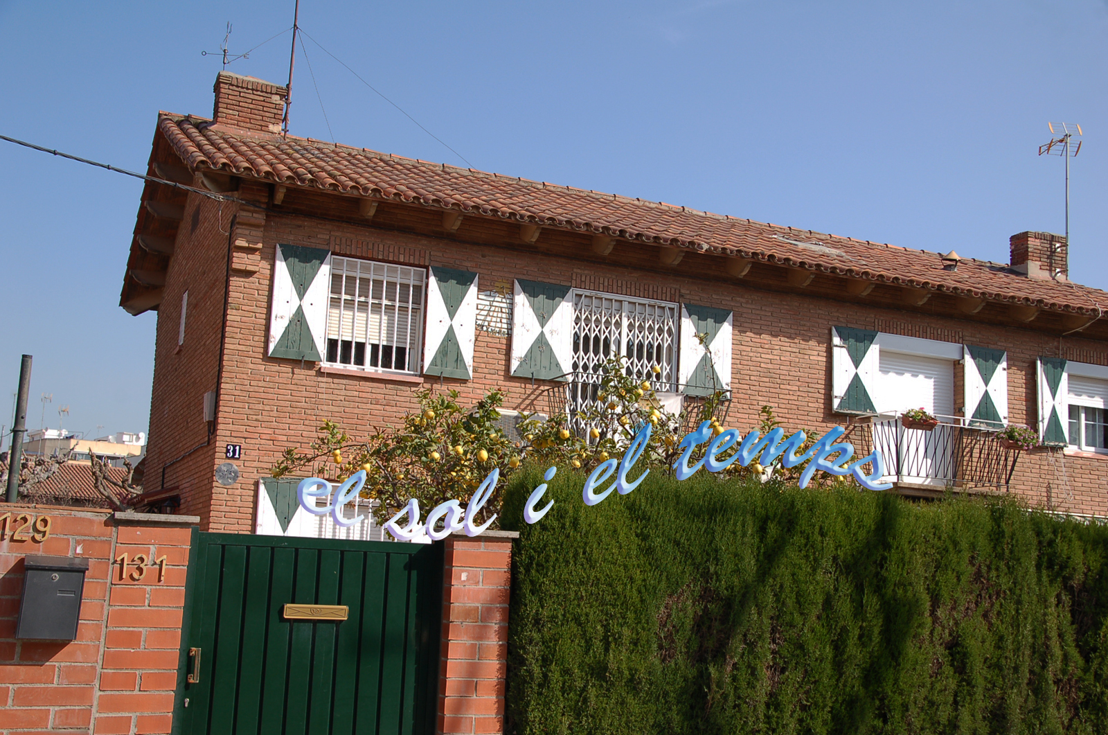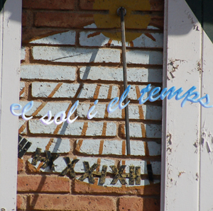:: DESCRIPCIÓ: Vertical de mati, de disseny senzill, pintat als totxos de la façana de la casa, línies horàries, números romans, gnòmon (50 cms) vareta, elevació 4 mts., no es veu tot el rellotge perquè el tapen els porticons de les finestres de la casa