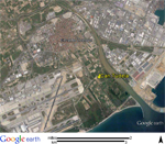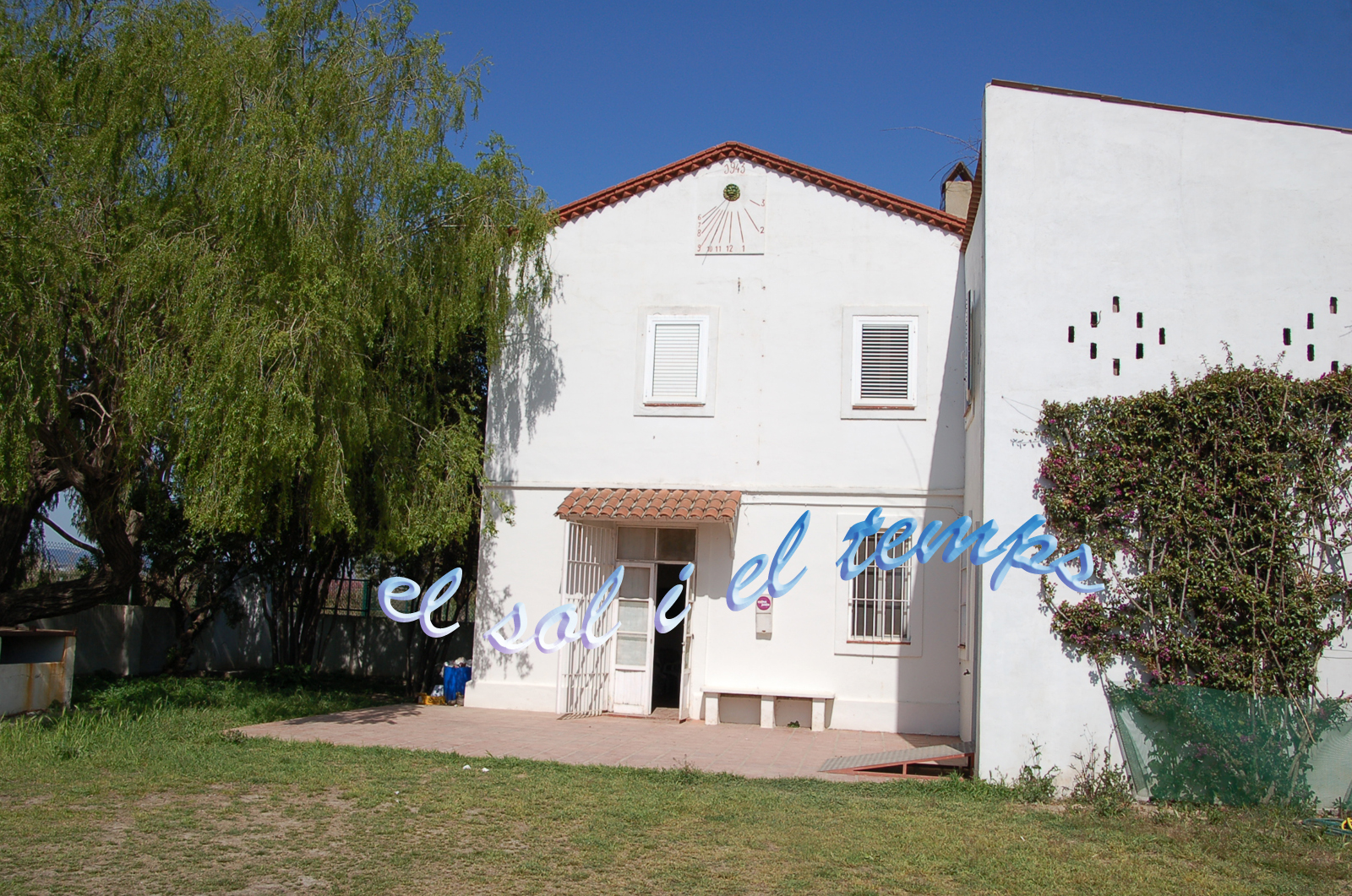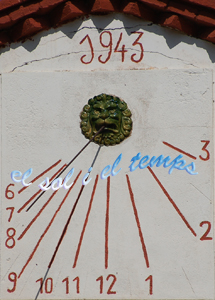 :: DESCRIPCIÓ: Vertical força declinant de matí, línies horàries, números àrabs (de 6 a 3), gnòmon (80 cms) vareta, datat, elevació 2 mts.