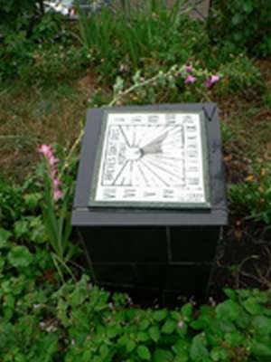 :: DESCRIPCIÓ: Quadrat horitzontal sobre un peu de pissarra, línies horàries i marques a les mitges hores, nums romans (VII a V), alçada 1 mt, mides 30 x 30 cm, gnòmon triangular