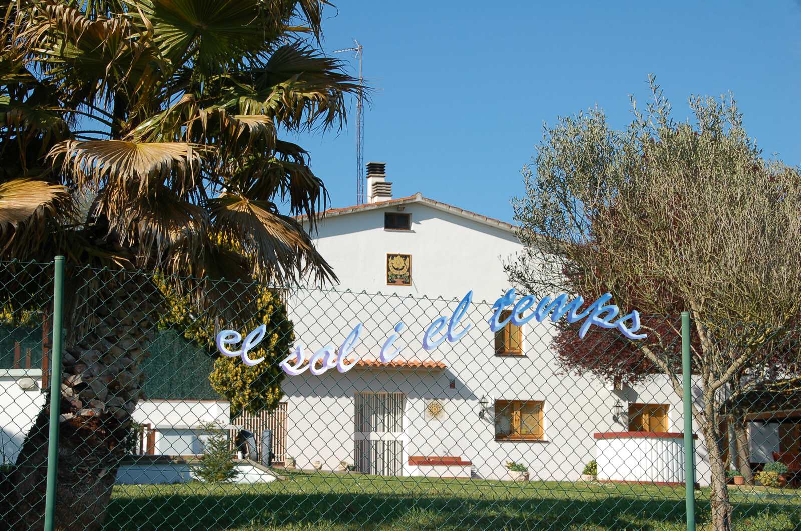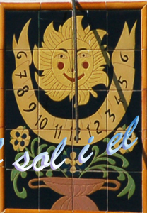 :: DESCRIPCIÓ: Vertical de tarda, composició de rajoles de ceràmica (4x5), línies horàries curtes, números àrabs (de 6 a 6) en banda, gnòmon (80 cms) vareta, elevació 115 mts.