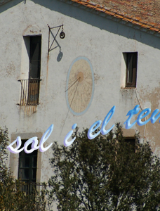 :: DESCRIPCIÓ: Vertical meridional ovalat, línies horàries i mitges hores curtes, no es veu numeració, gnòmon (30 cms) acabat en bola, elevació 168 mts.