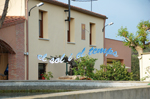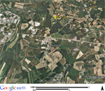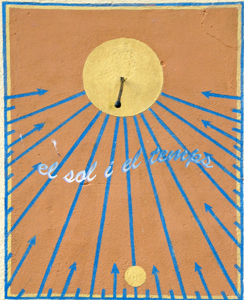 :: DESCRIPCIÓ: Vertical de tarda, línies horàries, mitges hores fletxades inverses i quarts més petites, sense numeració, cercle groc a migdia, gnòmon (30 cms.) acabat en bola, elevació 115 mts.