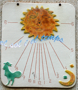 :: DESCRIPCIÓ: Vertical meridional, de sèrie, línies horàries, números àrabs (de 6 a 6), gnòmon absent, decorat amb el gall, la lluna i el sol al pol, elevació 96 mts.