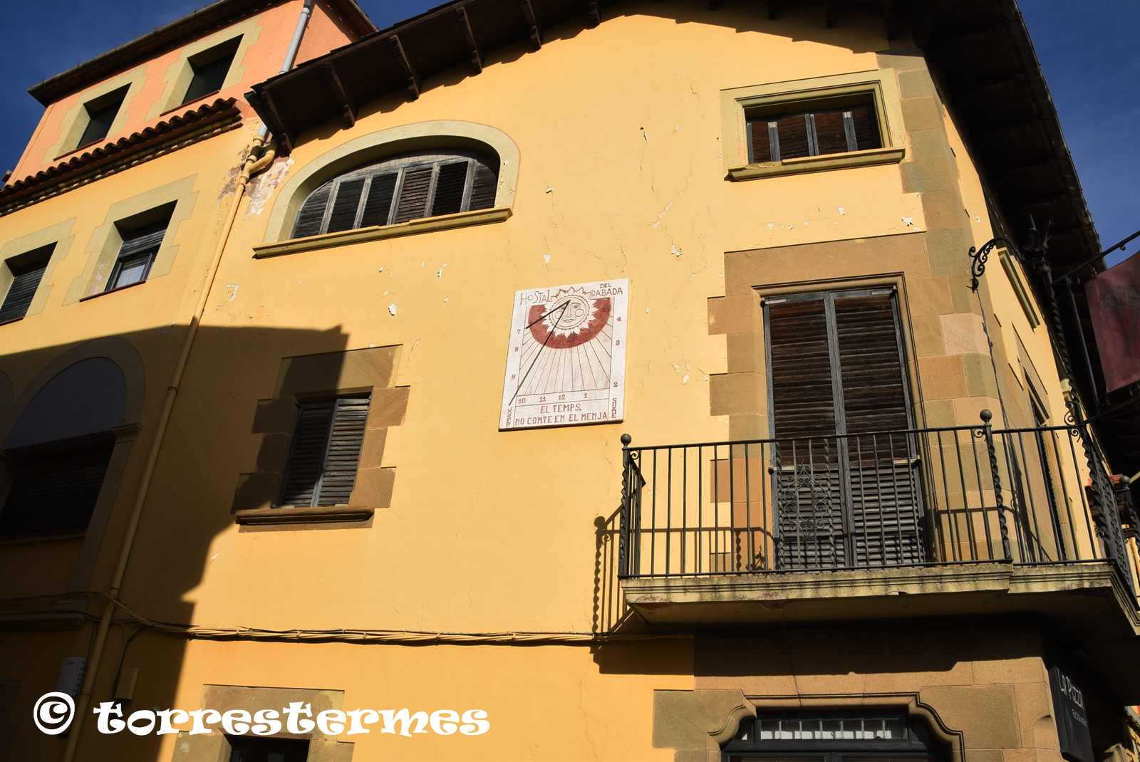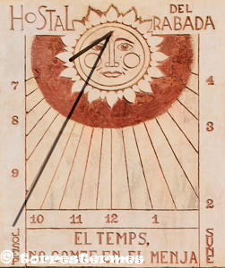 :: DESCRIPCIÓ: Vertical. Orientació Sud-est. Té un sol al pol, línies horàries a les hores i a les mitges hores i numeració aràbiga (de 7 a 4), signat, gnòmon (20 cms.) vareta, elevació 591 mts. snm.