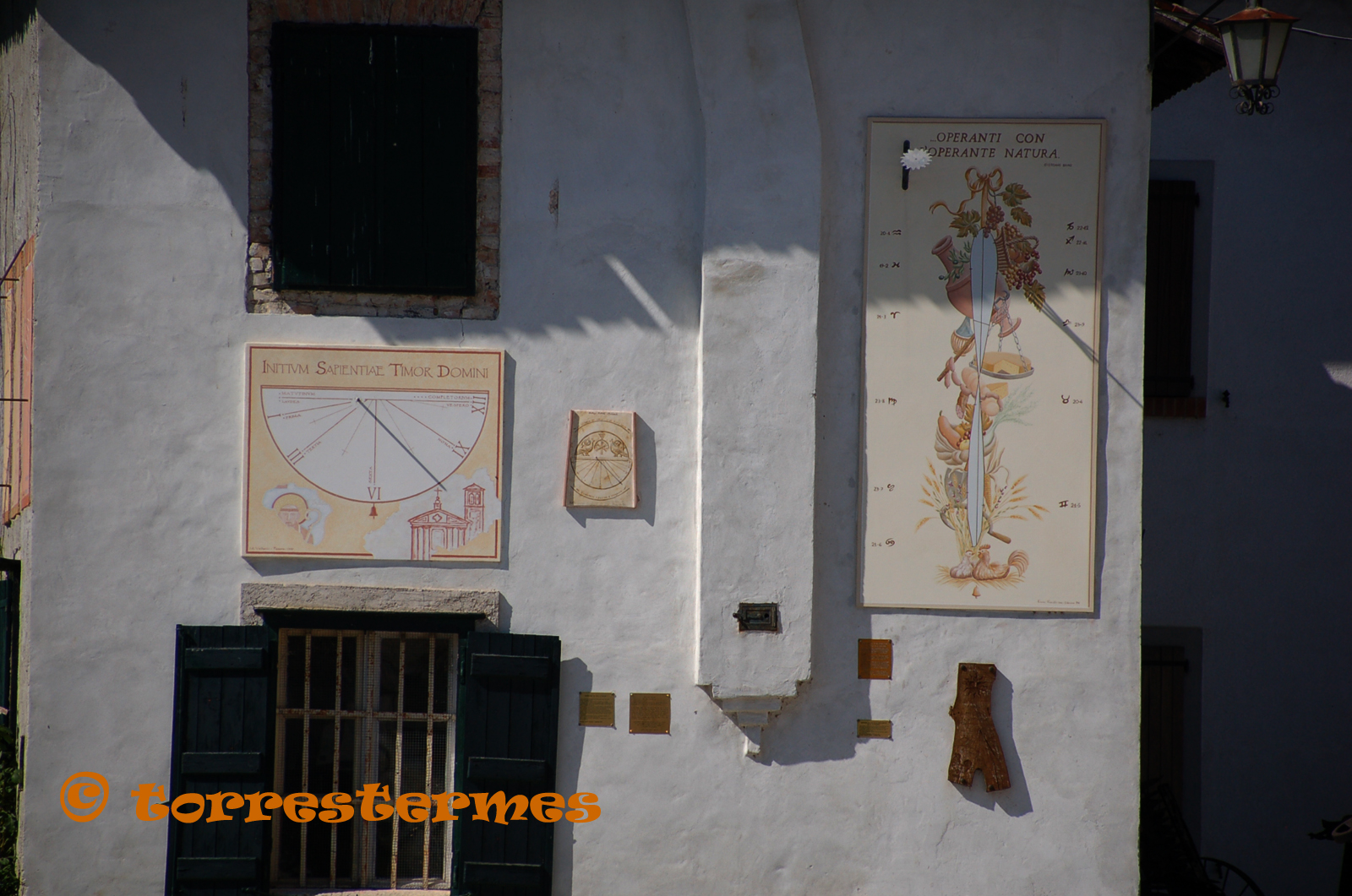 :: DESCRIPCIÓ: Vertical, d'hores medievals, línies horàries, números romans, gnòmon (5 cms.) orto, lema, signat i datat, elevació 15 mts.