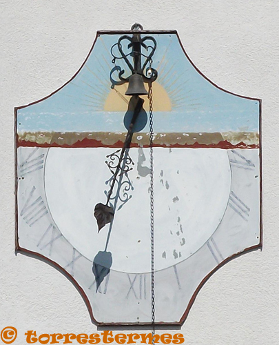 :: DESCRIPCIÓ: Vertical declinant de matí, una mica esborrat, sense línies, números romans (de VII a IV), gnòmon (60 cms.) acabat en cor fletxat, elevació 1 mt.