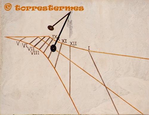 :: DESCRIPCIÓ: Vertical rectangular, força declinant de mati, línies horàries, solsticis i equinoccis, números romans (de V a I), gnòmon (20 cms.) acabat en disc foradat, elevació 11 mts.