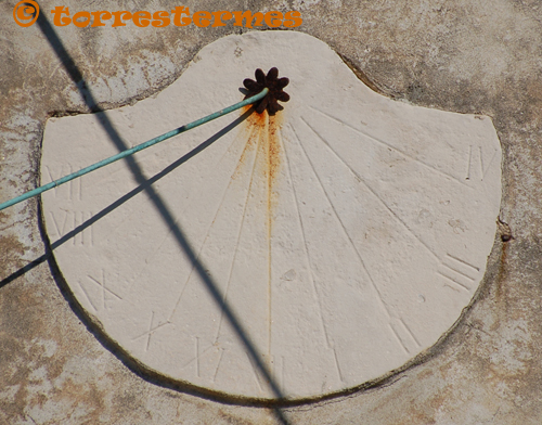 :: DESCRIPCIÓ: Vertical semicircular orientat a llevant, línies horàries, números romans (de VII a IV), gnòmon (50 cms.) vareta, elevació 8 mts.
