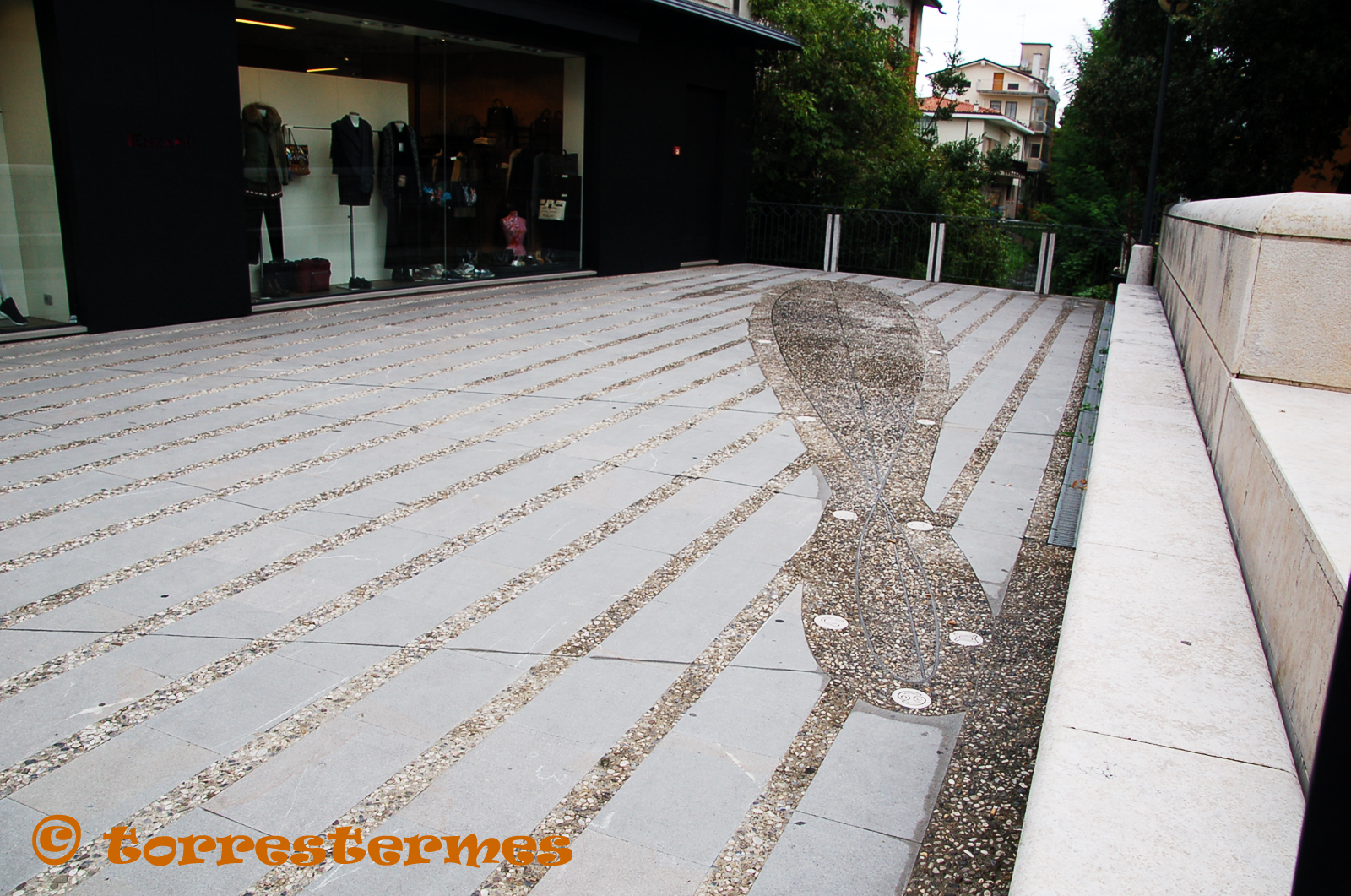 :: DESCRIPCIÓ: Meridiana horitzontal de temps local, marca el migdia vertader quan l'ombra del gnòmon (5 mts.) coincideix amb la línia sud nord, marca el migdia mig quan l'ombra coincideix amb la part de l'analema corresponent al període zodiacal en curs