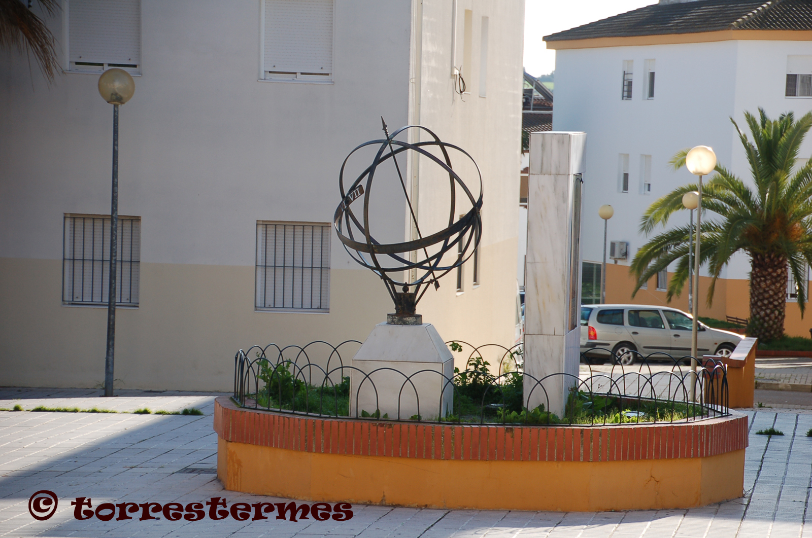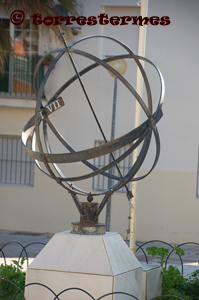 :: DESCRIPCIÓ: Esfèric simulant el globus terraqui, en la placa corresponent a l'equador, números romans (de VI a VI), gnòmon (2 mts.) fletxat, simula l'eix de la Terra, datat, elevació 107 mts.