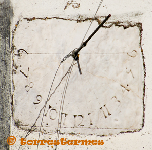 :: DESCRIPCIÓ: Vertical meridional rectangular, gravat sobre una placa de pedra, sense línies visibles, números àrabs (de 6 a 6) en corona, gnòmon (20 cms.) recte, elevació 510 mts.