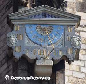 :: DESCRIPCIÓ: Doble rellotge vertical de matí, línies horàries i punts a les mitges hores, interior semicircular i numeració aràbiga (de 6 a 6), exterior quadrat i números romans (de VI a VI), gnòmon (25 cms.) recolzat, elevació 11 mts.