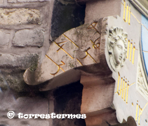 :: DESCRIPCIÓ: Vertical orientat a ponent, situat a l'esquerra del rellotge doble vertical, línies horàries, números àrabs (de 3 a 7), el gnòmon és el lateral que sobresurt del rellotge principal, elevació 11 mts.
