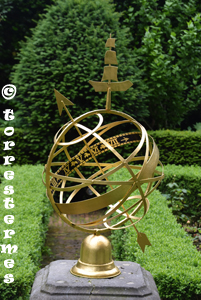 :: DESCRIPCIÓ: Esfera metàl·lica formada per bandes horitzontals que simulen l'equador i els tròpics i vertical el meridià 0, a la línia equatorial hi ha la numeració romana (de V a VII) i la data, gnòmon fletxat (1 mt.) simulant l'eix de la Terra, elevació 45 mts.