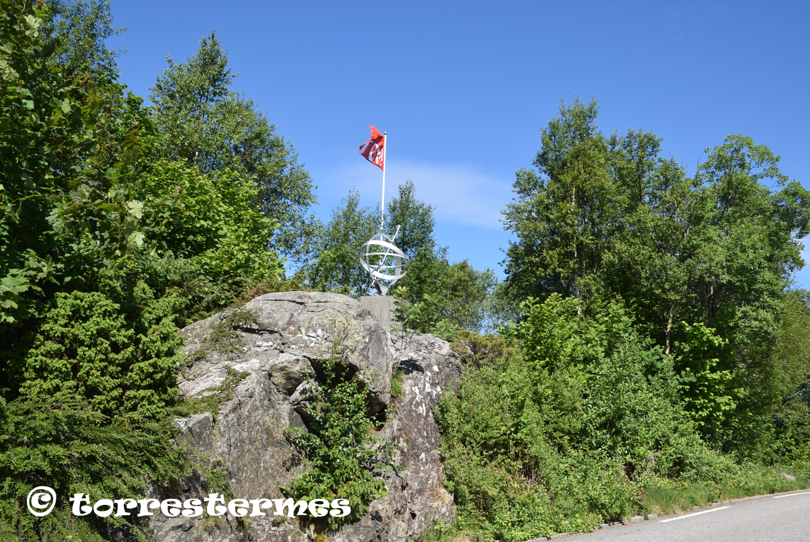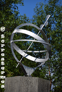 :: DESCRIPCIÓ: Esfera metàl·lica formada per bandes horitzontals que simulen l'equador i els tròpics i vertical el meridià 0, a la línia equatorial hi ha la numeració aràbiga (de 6 a 6), gnòmon fletxat (1 mt.) simulant l'eix de la Terra, elevació 33 mts.