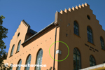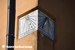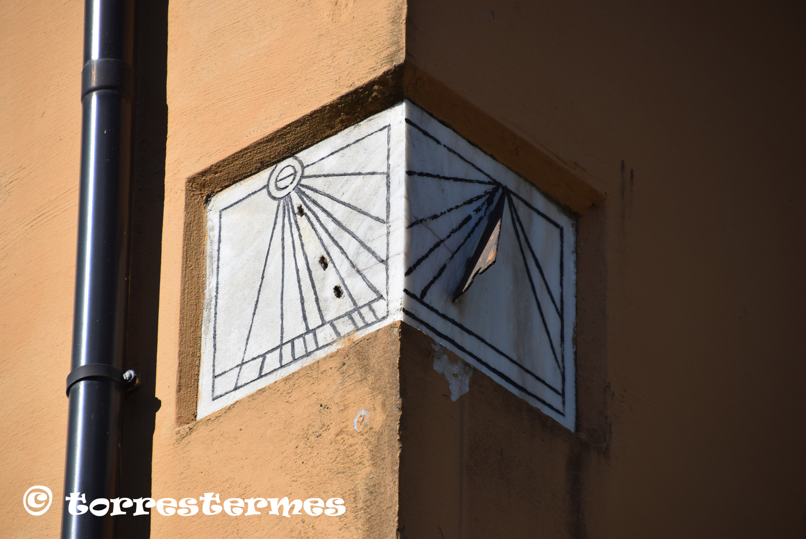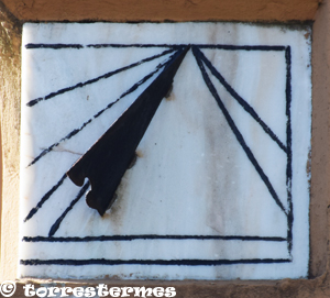 :: DESCRIPCIÓ: Parella de quadrants complementaris, el de matí, línies horàries, sense numeració, gnòmon (15 cms.) placa triangular, elevació 19 mts.