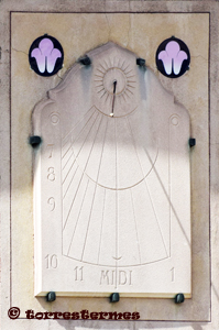 :: DESCRIPCIÓ: Vertical declinant a ponent, gravat en una placa de pedra, línies horàries i mitges hores, números àrabs (de 7 a 1), gnòmon (30 cms.) fletxat, elevació 304 mts.