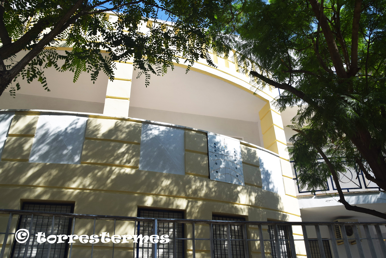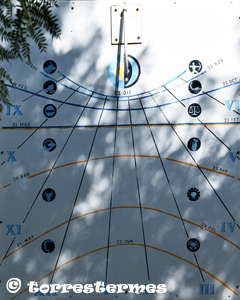 :: DESCRIPCIÓ: Vertical meridional, difícil de veure per estar quasi tapat pels arbres, línies horàries, solsticis i equinoccis, zodiacals, números romans (de IX a VI), hora oficial d'hivern, migdia desviat, gnòmon (25 cms.) vareta, elevació 16 mts.