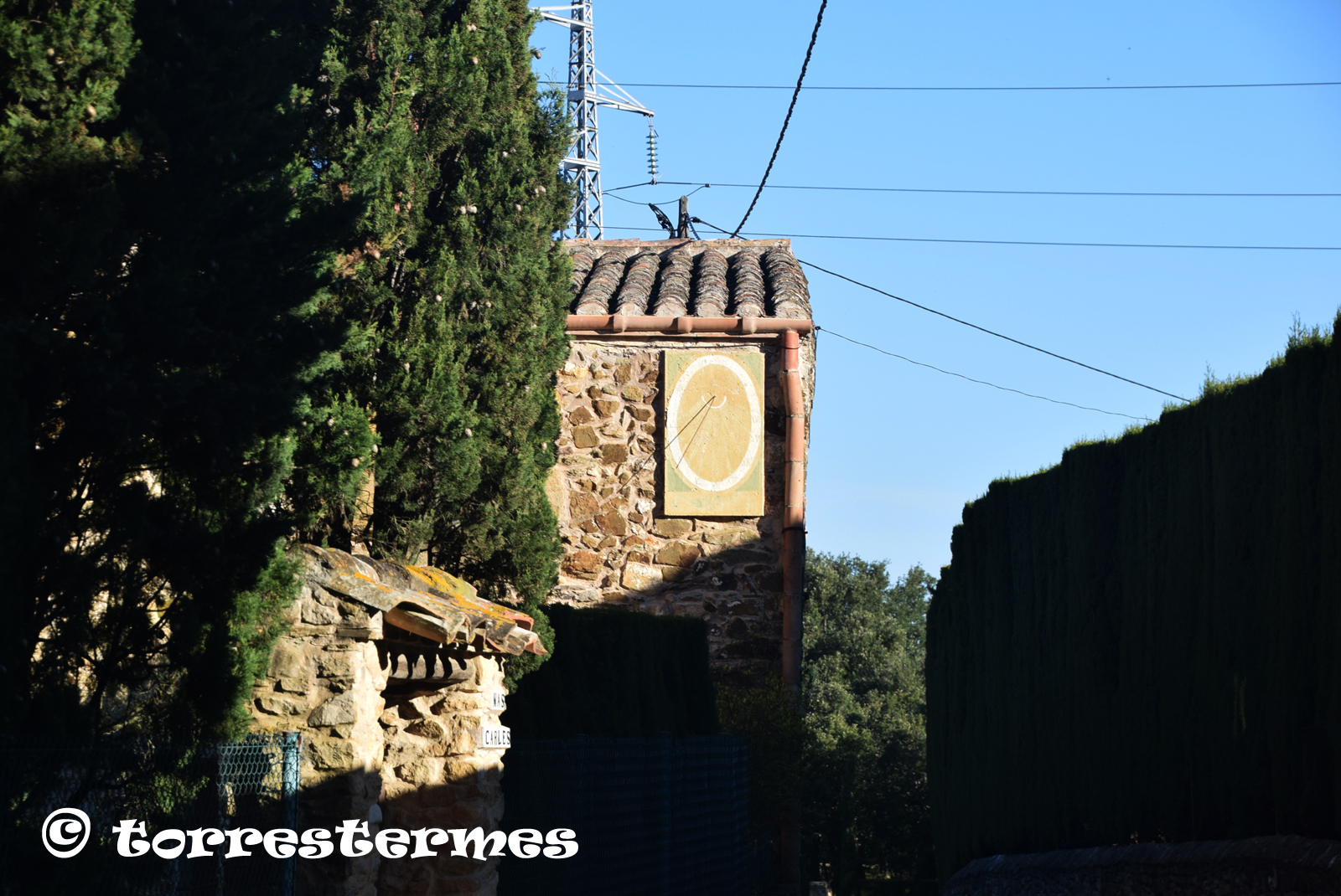 Vertical quasi meridional, força esborrat, línies horàries, s'endevina numeració romana (de VII a XVI), gnòmon (60 cms.) vareta, elevació 116 mts.