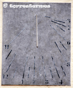 :: DESCRIPCIÓ: Vertical quadrat meridional, una mica despintat, línies horàries i mitges hores més curtes, numeració aràbiga (de 11 a 8), gnòmon (40 cms.) vareta, elevació 182 mts.
