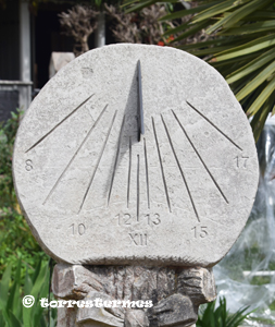 :: DESCRIPCIÓ: Vertical circular meridional, línies horàries, línia meridiana (XII), números àrabs (de 8 a 17), gnòmon (10 cms.) triangular, elevació 165 mts.