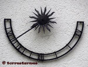 :: DESCRIPCIÓ: Vertical semicircular, orientat a llevant, marques a les hores, números romans (VI, IX, XII, XV), gnòmon (30 cms.) vareta, elevació 201 mts.
