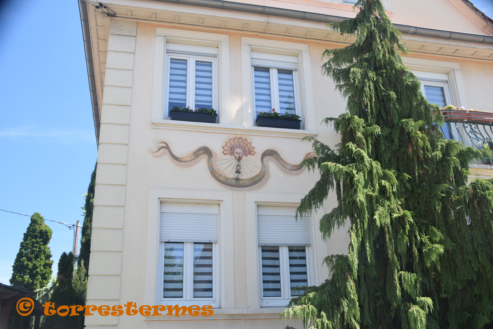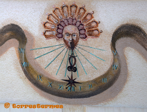 :: DESCRIPCIÓ: Vertical lleugerament orientat a ponent, línies horàries, números romans (de VII a V) en banda, gnòmon (40 cms.) forjat i historiat, elevació 154 mts.