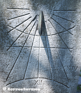 :: DESCRIPCIÓ: Vertical meridional, gravat en un bloc de pedra que conte, al cap damunt, un quadrant esfèric, línies horàries, solsticis i equinoccis, números romans (X, XII, XIV), gnomon (10 cms) triangular, elevació 282 mts.