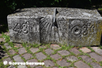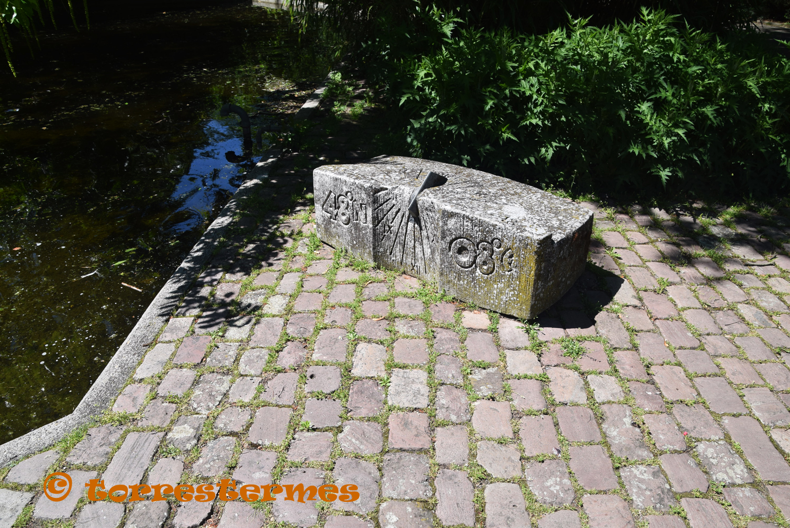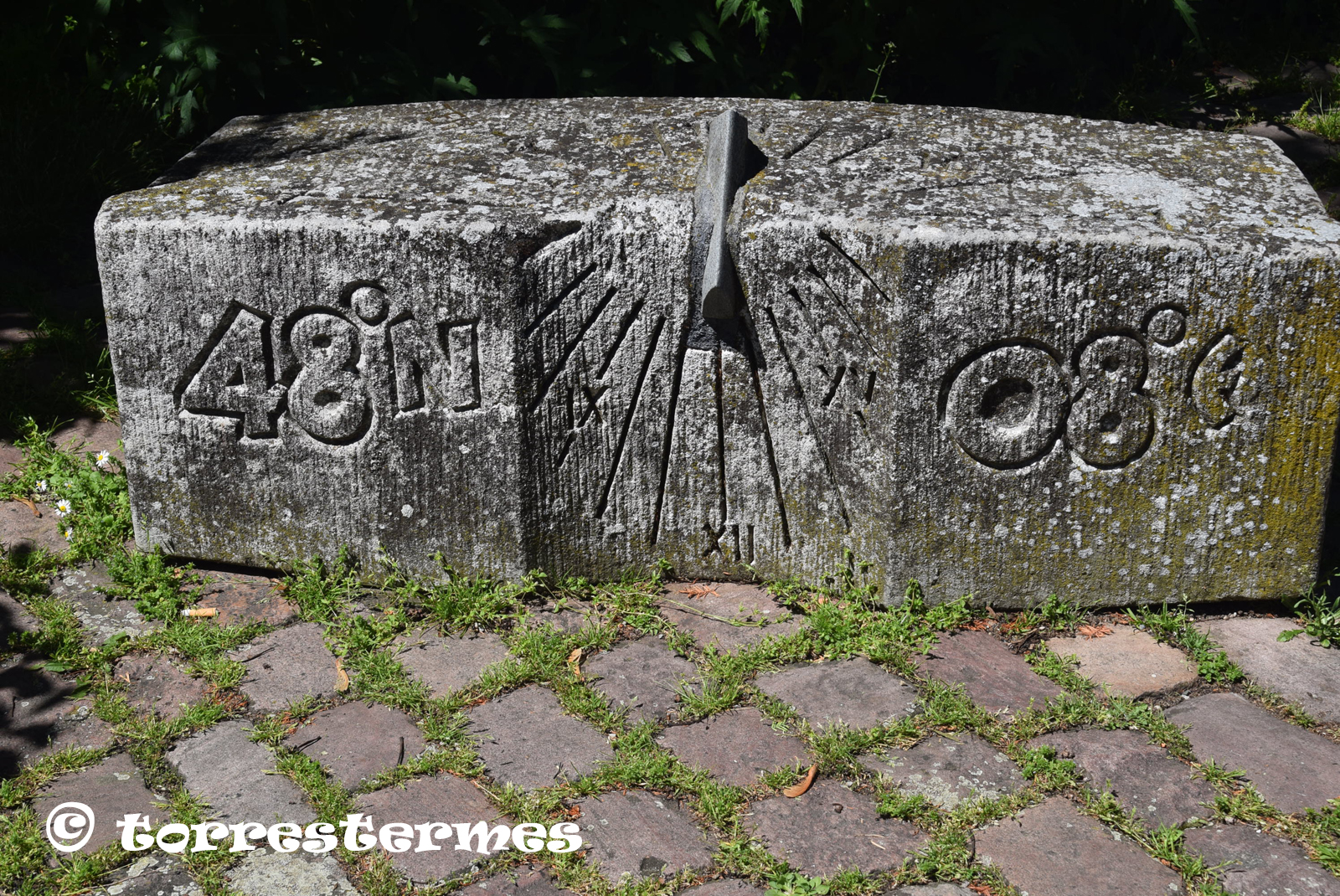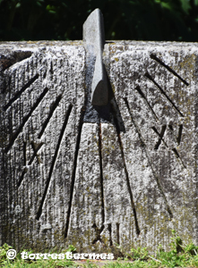 :: DESCRIPCIÓ: Vertical meridional, gravat en un bloc de pedra que conte, al cap damunt, un quadrant horitzontal, línies horàries, números romans (IX, XII, XV), gnòmon (10 cms) triangular, elevació 282 mts.