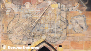 :: DESCRIPCIÓ: Vertical molt declinant a llevant, força despintat, línies horàries, números romans (de IV a XII) en banda, gnòmon (80 cms.) recolzat, elevació 200 mts.